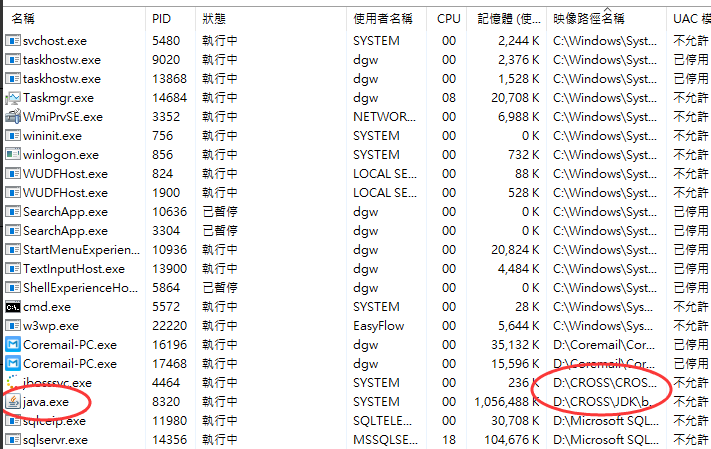 3.回到工作管理員〉 詳細資料〉 找java 進程,路徑名稱中有CROSS
