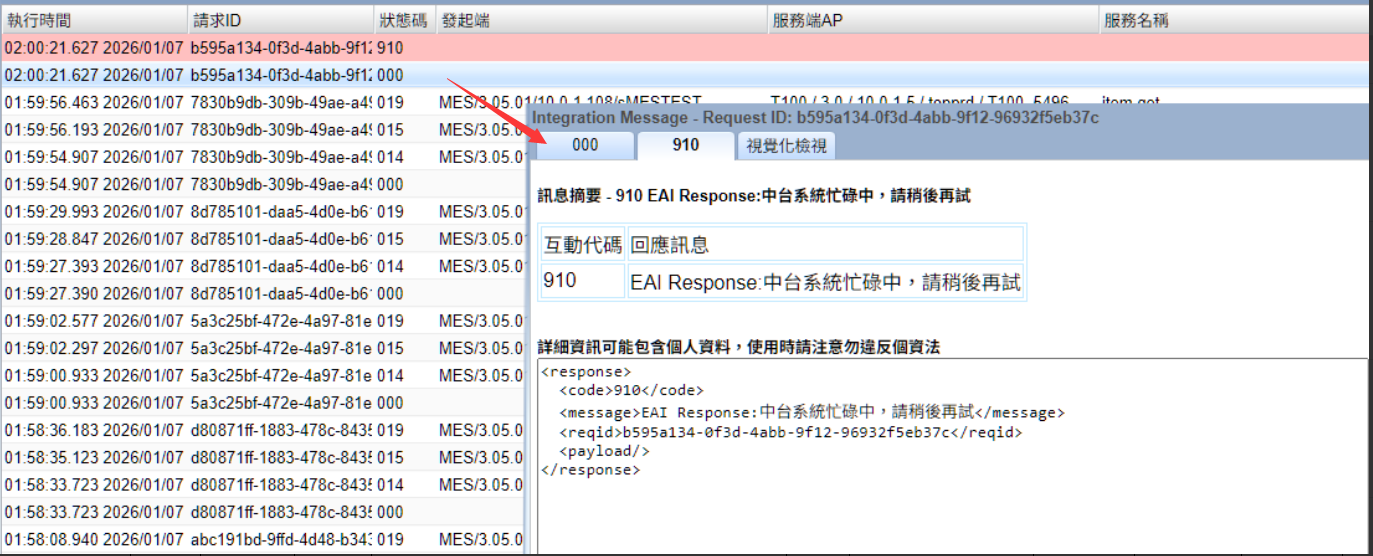 回傳的資料量太大,或多次拋轉後常會發生> 910 中台系統忙碌中,請稍後再試