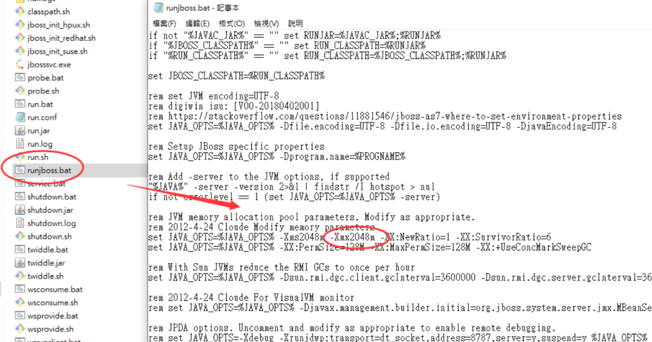 2. 至bin/runjboss.bat 下修改最大記憶體上限(2G>4G)。